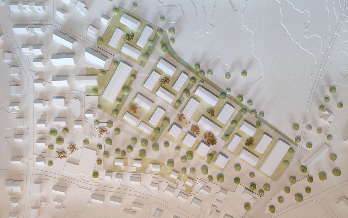 Mit einer einfachen und robusten städtebaulichen Grundstruktur wird eine zukunftsfähige Stadtentwicklung ermöglicht. Der Schwerpunkt liegt dabei auf flächeneffizienten Geschossbauten und vielfältigen Wohnformen. Besondere Merkmale sind der Verzicht auf Unterbauungen mit Tiefgaragen, der Erhalt und die Weiterentwicklung der vorhandenen Streuobstwiesen sowie eine ausgeprägte ökologische Freiflächengestaltung mit integriertem Regenwassermanagement.