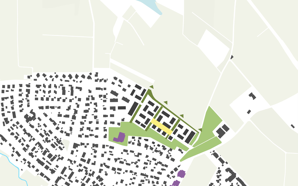 Der Entwurf für den neuen Stadtteil schlägt 6 Nachbarschaftsquartiere mit jeweils variierenden Bautypologien und Wohnformen vor. Halböffentliche und private Freiräume vernetzen sich mit den ortsbildprägenden bestehenden und neuen Obstbaumwiesen. Die Grünfugen gliedern die Stadtquartiere und dienen gleichzeitig ihrer Vernetzung sowie der Regenwasserrückhaltung und -versickerung. Die bestehende Streuobstwiese im südlichen Plangebiet wird erweitert und als öffentliche Grünfläche für die gesamte Nachbarschaft im Bestand und die neuen Stadtquartieren entwickelt.